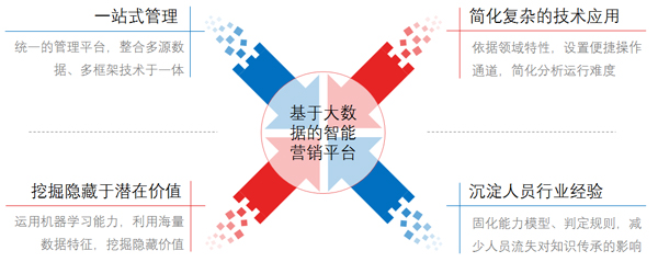智能營銷平臺依托大數據、分析應用和知識圖譜模型,將多源客戶數據集成,并進行自然語言標簽化處理,從而構建客戶標簽庫、客戶畫像、客戶分群及營銷規則。在此基礎之上,同時建立標簽與營銷管理平臺互動支撐的營銷全流程管理,協助銀行金融機構實現以數據驅動的精準營銷模式。